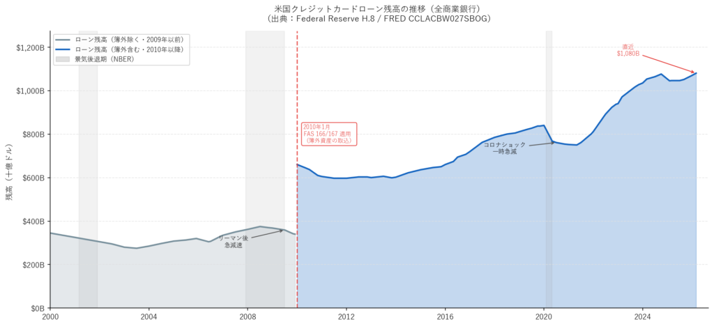 なお、2010年1月にFASB会計基準(FAS 166/167)が適用され、商業銀行が簿外に保有していた証券化クレジットカード債権を貸借対照表に取り込んだため、グラフに構造的な断絶(約+3,000億ドルの急増)が生じています。2009年以前と以降のデータは直接比較できません。