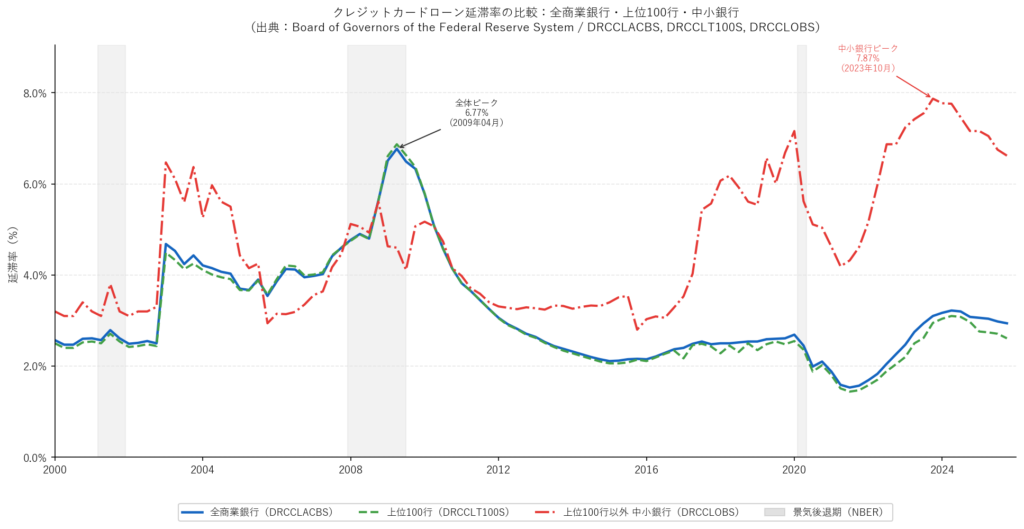 • 上位100行:JPモルガン・バンク・オブ・アメリカなど大手行。消費者向けクレジットカード市場の約97%を占め、全体の延滞率に最も大きく影響します。リーマンショック時のピーク延滞率は6.9%でした。
