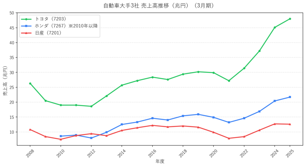 出典:各社決算短信 ― IRBANK(トヨタ)・IRBANK(ホンダ)・IRBANK(日産)