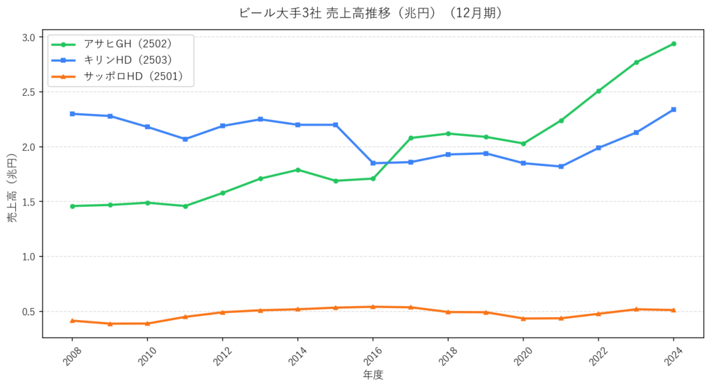 出典:各社決算短信 ― IRBANK(アサヒGH)・IRBANK(キリンHD)・IRBANK(サッポロHD)