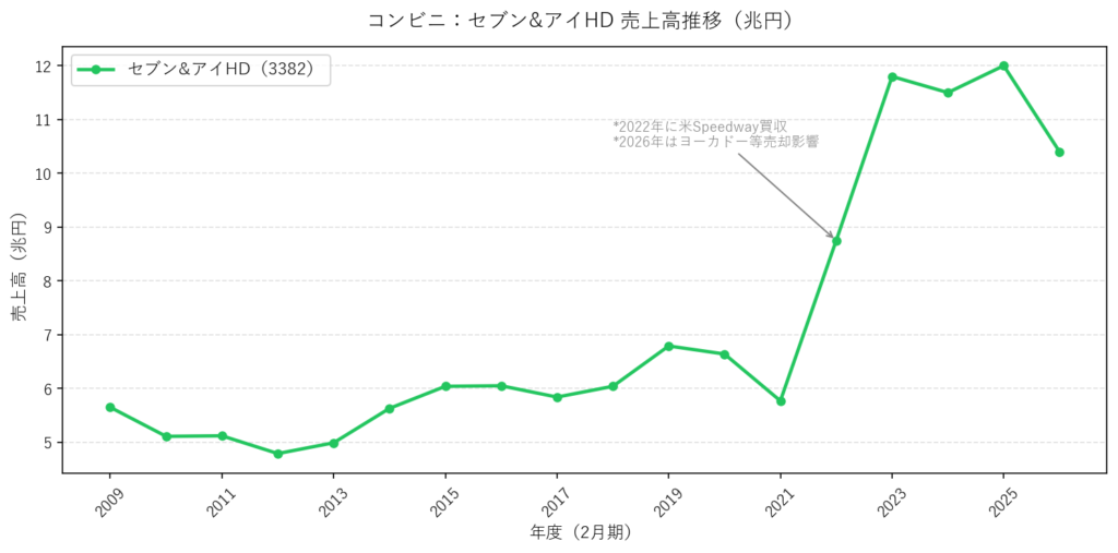 - コンビニは実質セブン&アイHD一択だが、ローソン・ファミリーマートの上場廃止により選択肢が大幅に減少した点は要注意
