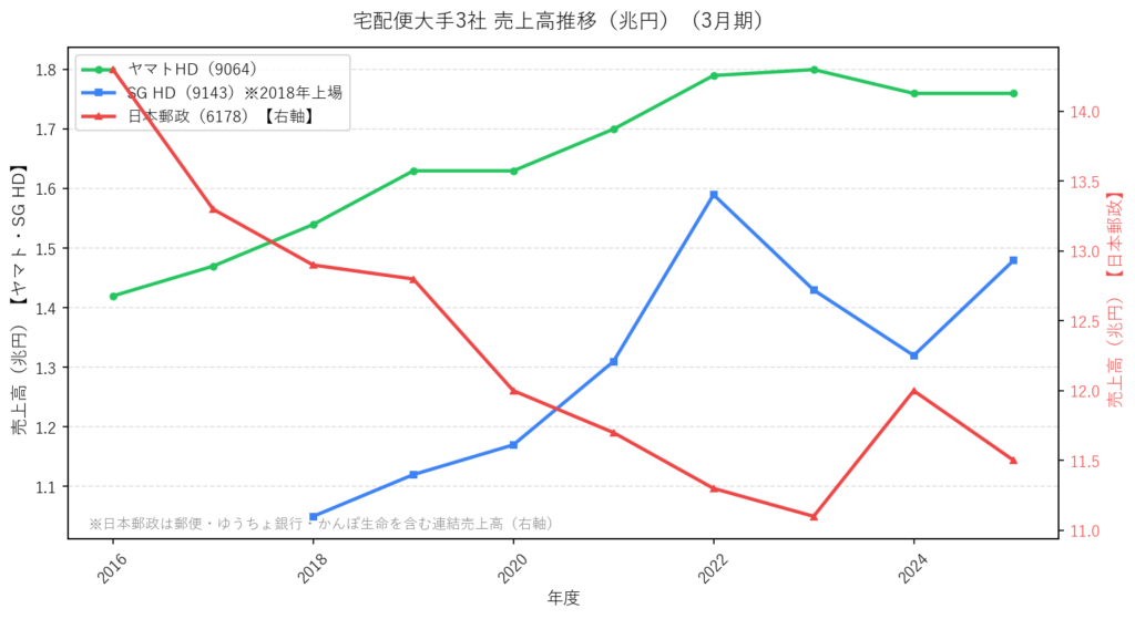 出典:各社決算短信 ― IRBANK(ヤマトHD)・IRBANK(SG HD)・IRBANK(日本郵政)