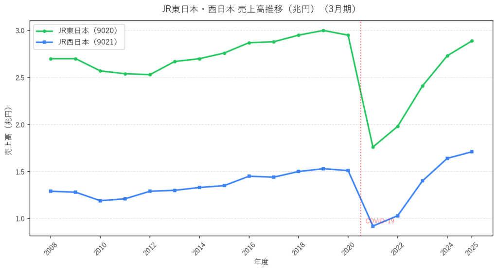 出典:各社決算短信 ― IRBANK(JR東日本)・IRBANK(JR西日本)