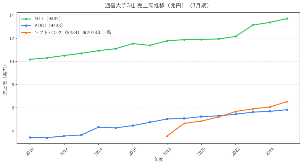 出典:各社決算短信 ― IRBANK(NTT)・IRBANK(KDDI)・IRBANK(ソフトバンク)