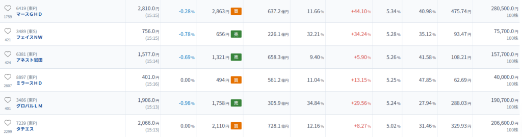 スクリーニングの結果、16銘柄がヒットしました。そのうち配当利回り上位5銘柄を以下にまとめます。