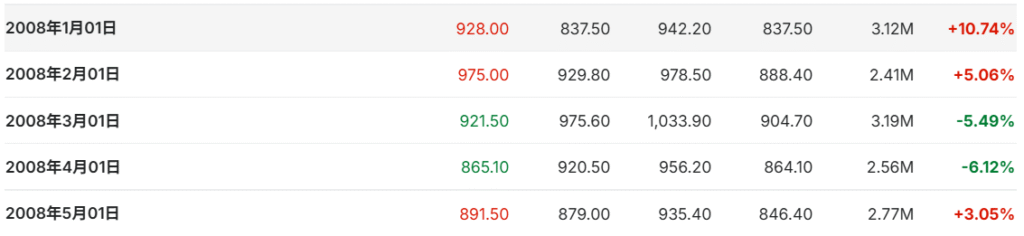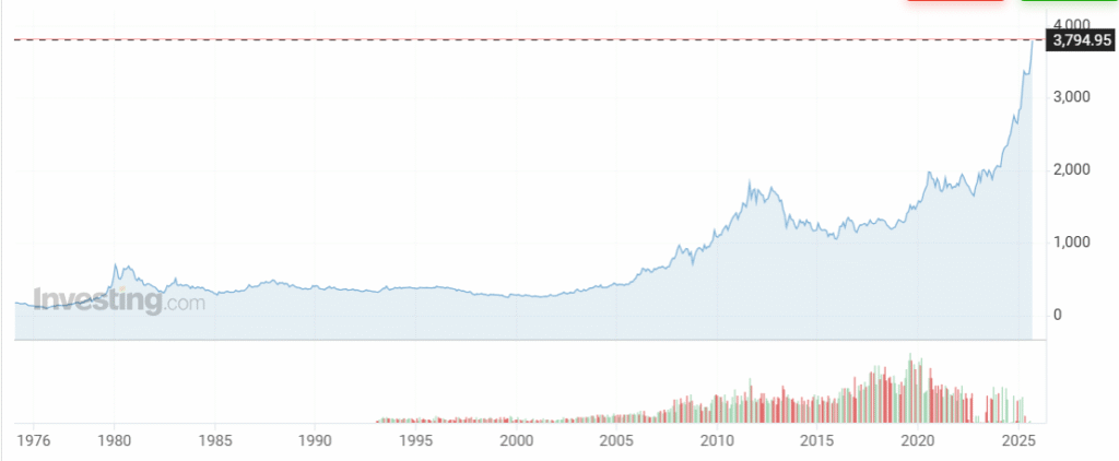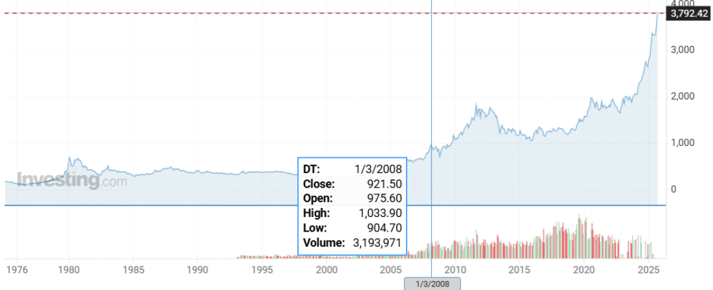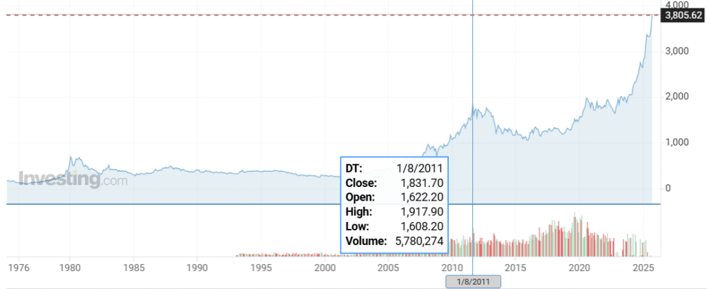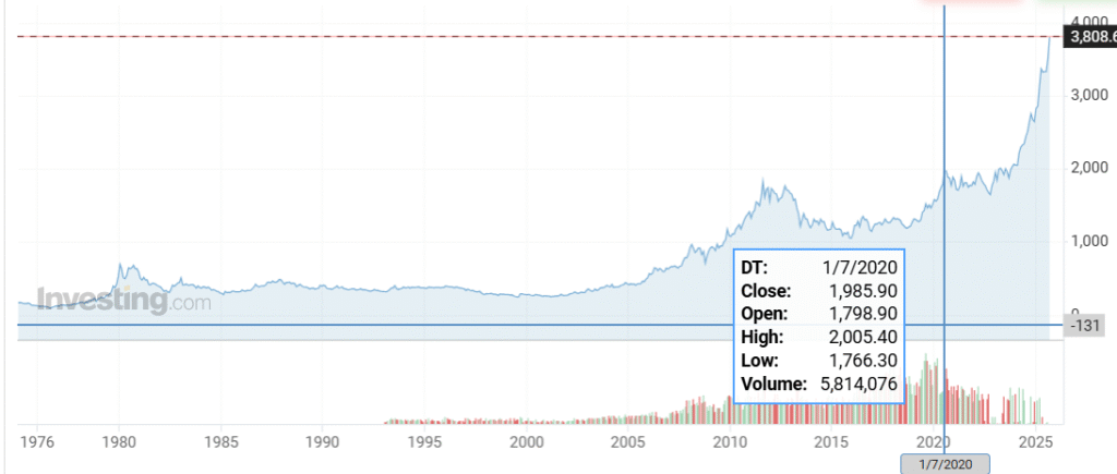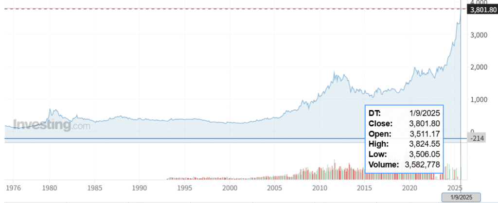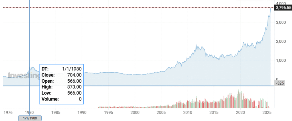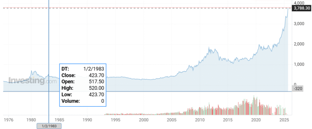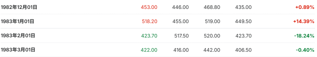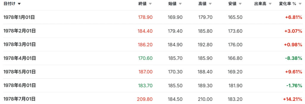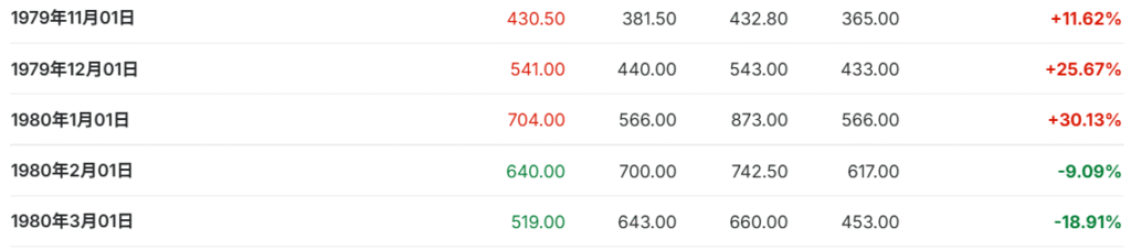 ・過去の表を見ると、起点は1978年の5月。そこからピークの1980年1月まで5.2倍(+420%)の上昇を認めます。