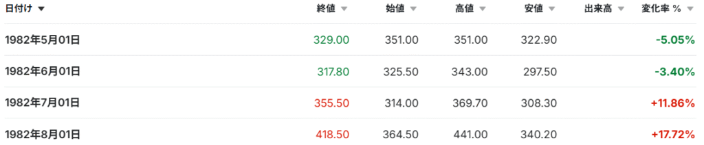 ・起点は1982年7月で、そこからピークの1983年1月まで1.68倍(+68%)の上昇を認めます。