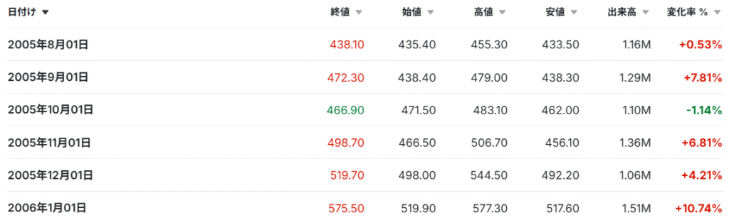 ・起点は2005年9月で、ピークの2008年3月まで2.4倍(+140%)の上昇を認めます。