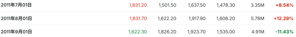 ・起点は2008年11月で、ピークの2011年8月まで2.7倍(+170%)の上昇を認めます。