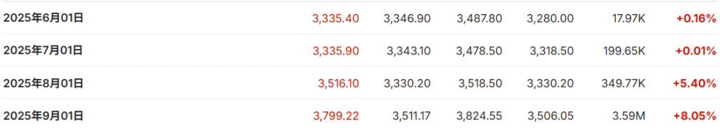 ・起点は2024年3月で、ピークはまだ形成していませんが現在まで1.9倍(+90%)の上昇を認めます。