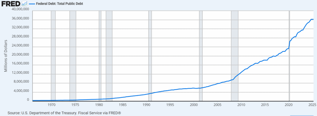 同じタイミングで上昇し続けている物があります。それは米国の公的債務残高です。