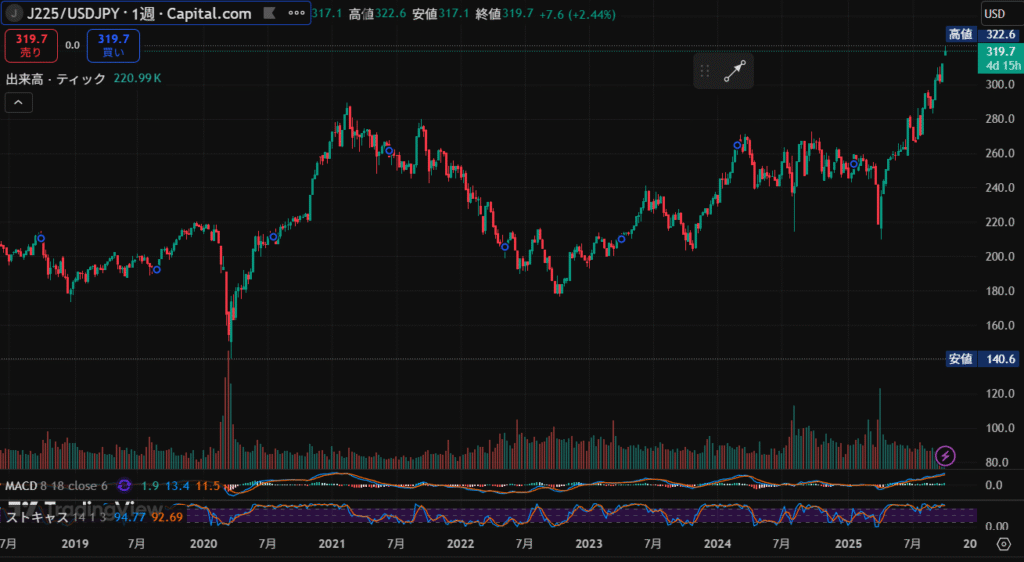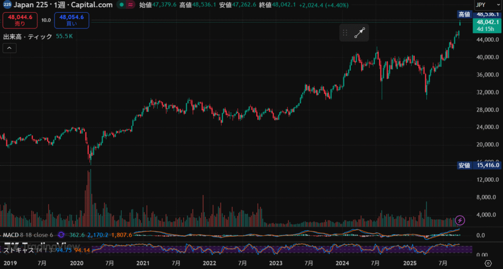 2025年4月を起点に日経平均株価は上昇基調でしたが、本日は窓をあけて上昇しています。