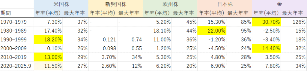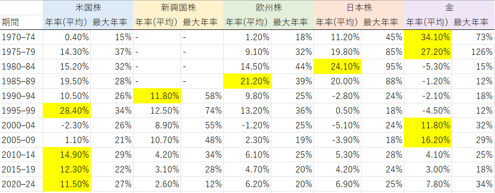 10年毎で見ると、連続で主役となる投資先はありませんでしたが、このままのペースでいくと米国株は連続で主役となる可能性があります。