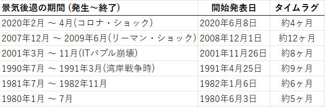 そのため、実際の景気後退開始時と発表日には半年~1年のタイムラグがあるといわれています。