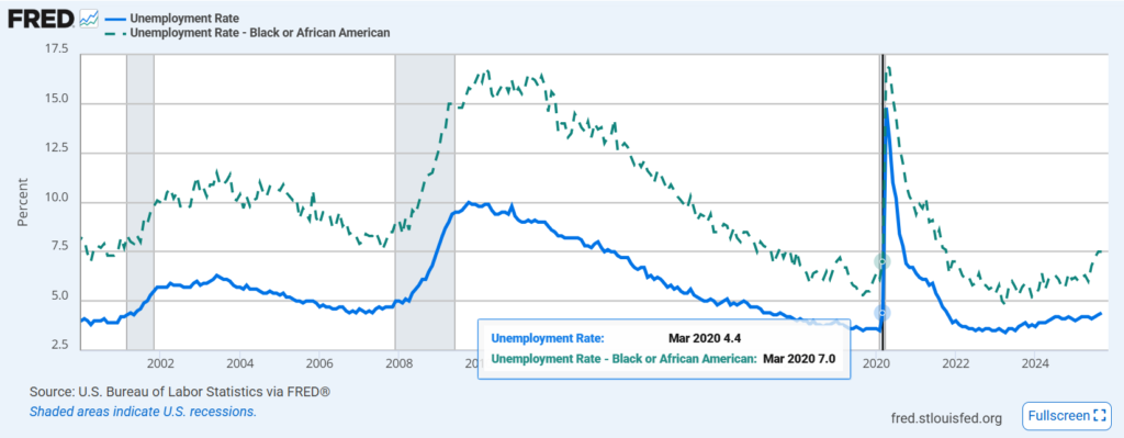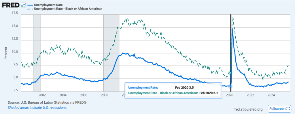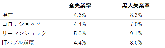 コロナショック時の景気後退開始は2020年2月で、この時の全失業率は3.5、黒人の失業率は6.1でした。これは1月の失業率を表しています。