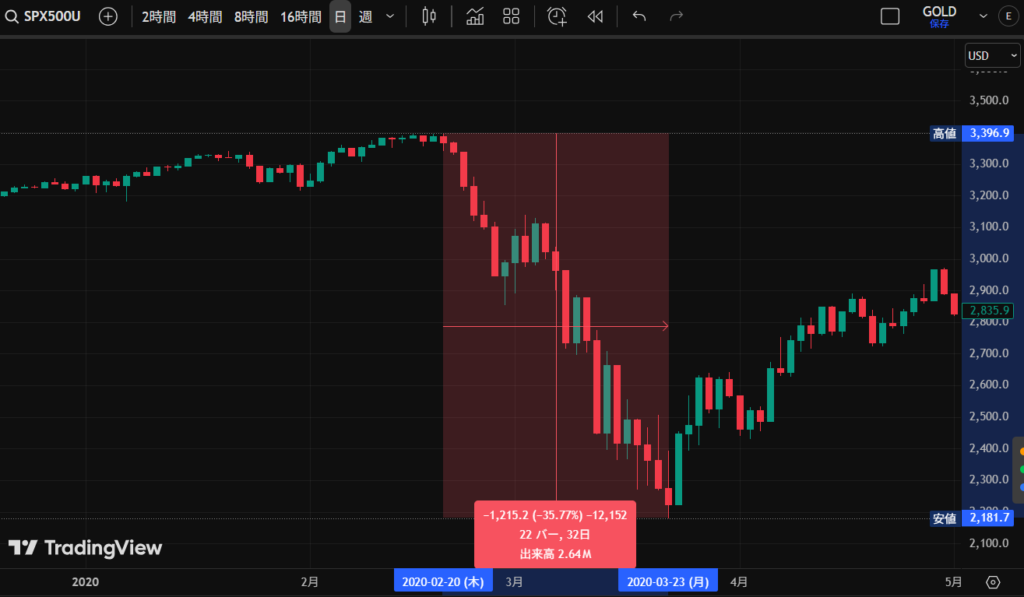 S&P500は景気後退期の2月20日をピークに35%の下落を認めています。