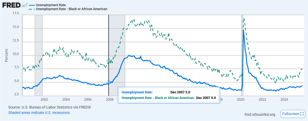 リーマンショック時の景気後退開始は2007年12月で、この時の全失業率は5.0、黒人の失業率は9.0です。これは2007年11月の失業率を表しています。