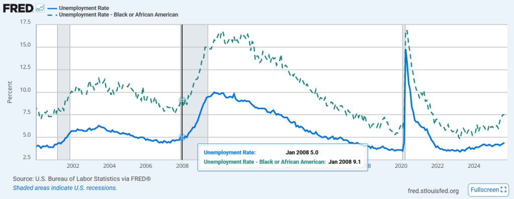 翌2008年1月発表の12月の失業率は全失業率は5.0、黒人の失業率は9.1と微増しています。