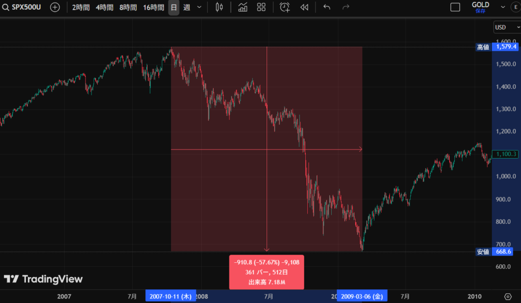 S&P500は景気後退期前の2007年10月17日をピークに57%の下落を認めています。