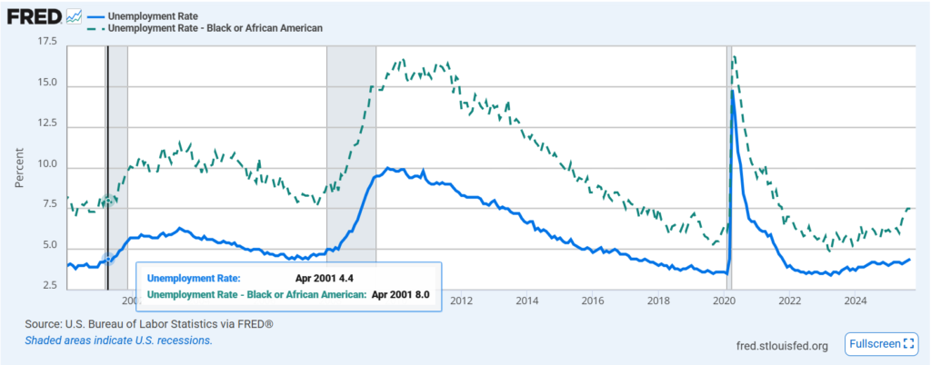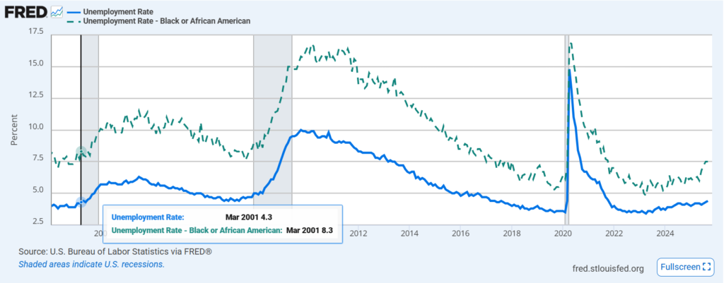 ITバブル崩壊時の景気後退開始は2001年3月で、この時の全失業率は4.3、黒人の失業率は8.3です。これは2001年2月の失業率を表しています。