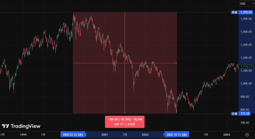 S&P500は景気後退期前の2000年3月22日をピークに50%の下落を認めています。