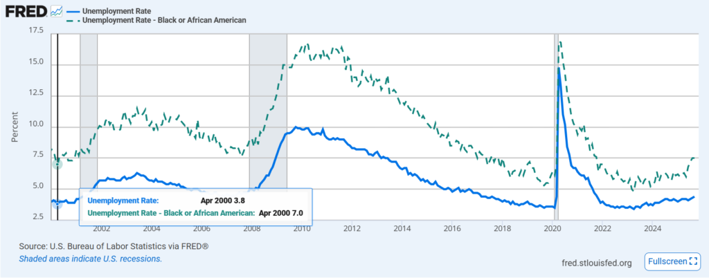ちなみに、株価のピークを付けた2000年3月の失業率は全失業率が3.8、黒人の失業率が7.0でした。