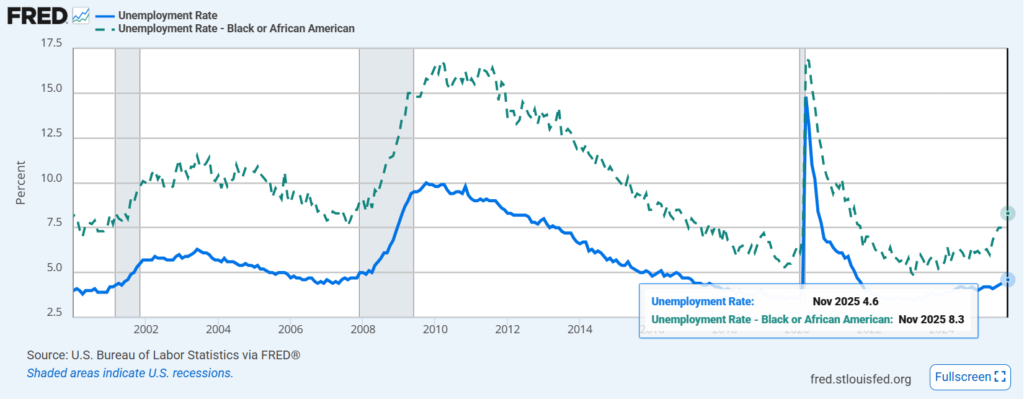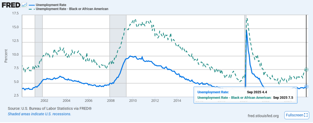今回は政府閉鎖により米国雇用統計の発表延期と10月分のデータ欠損が起こっています。1か月分が欠損した異例の状態ですが、全失業率が4.4%→4.6%、黒人失業率が7.5→8.3と上昇しています。