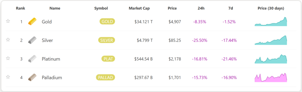 金・銀・プラチナ・パラジウムの1日で減少した時価総額合計は4兆3040億米ドル(現在のレートで666兆1,731億円)であったことが分かりました。